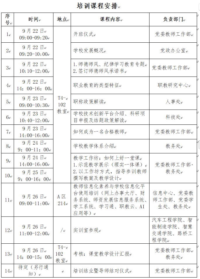 为深入贯彻《国家职业教育改革实施方案》《教育部办公厅关于开展职业教育教师队伍能力提升行动的通知》等文件精神,全面落实立德树人根本任务,切实提升我校新入职教师的政治素养、师德修养、教学能力与育人水平,帮助其快速完成角色转变、适应职业本科教育特点与岗位要求,结合我校实际情况,拟开展2025年新入职教师培训,现将相关事项通知如下: